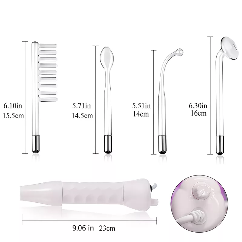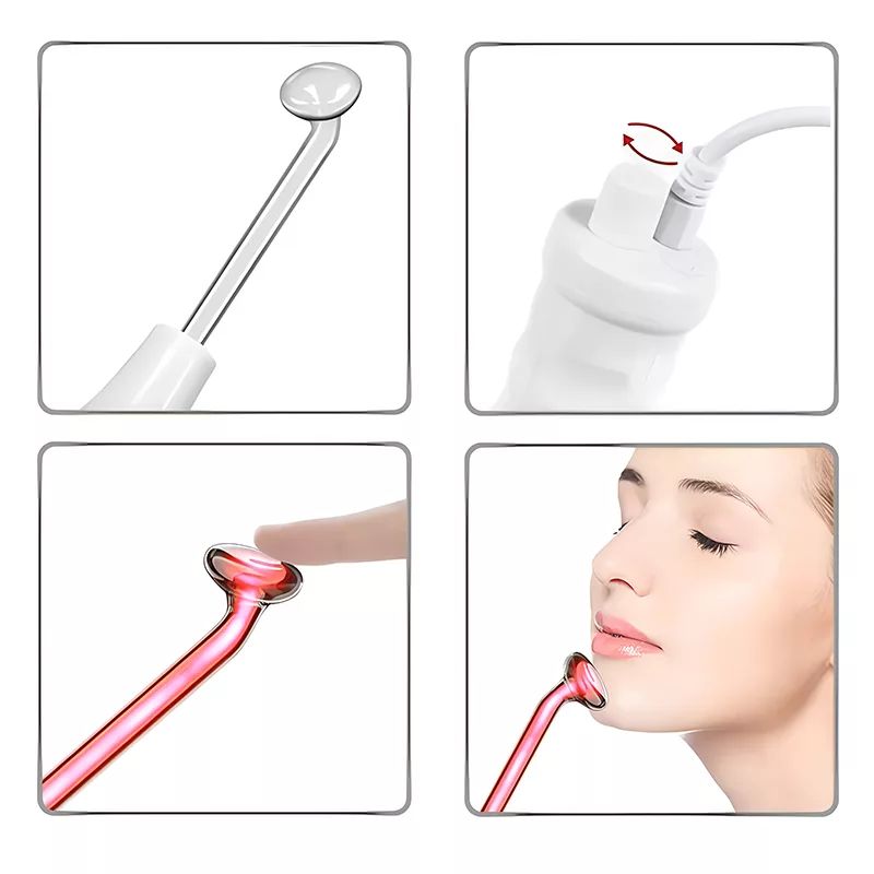Deze hoogfrequentiewand verbetert de circulatie om je gezicht een gezonde gloed te geven. Het vermindert zichtbaar fijne lijntjes en verstevigt slappe gebieden. Het is eenvoudig thuis te gebruiken en levert spa-achtige resultaten.